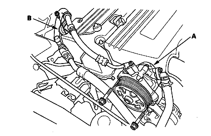 17. Remove the power steering (P/S) pump (A) without disconnecting the P/S hoses, then remove the P/S hose bracket (B).