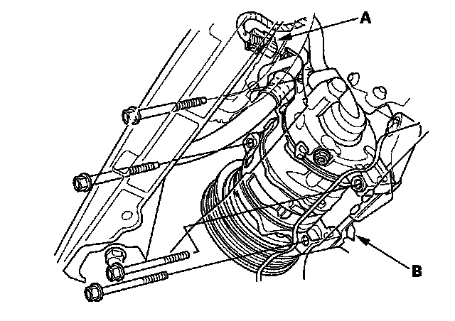 49. Disconnect the A/C compressor clutch connector (A), then remove the A/C compressor (B) without disconnecting the A/C hoses.