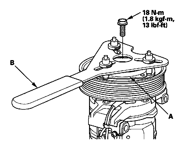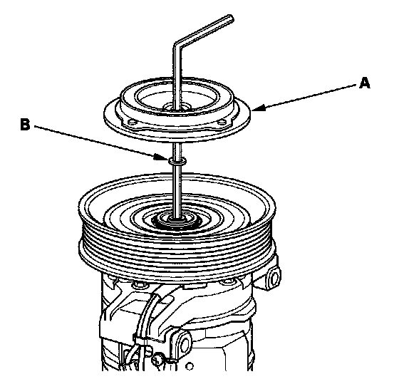 1. Remove the center bolt while holding the pressure plate (A) with a commercially available A/C clutch holder (B).