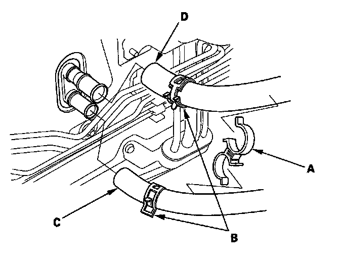 4. From under the hood, remove the clamp (A). Slide the hose clamps (B) back. Disconnect the inlet heater hose (C) and the outlet heater hose (D) from the heater unit. Note the orientation of the hose. Engine coolant will run out when the hoses are disconnected; drain it into a clean drip pan. Be sure not to let coolant spill on the electrical parts or the painted surfaces. If any coolant spills, rinse it off immediately.