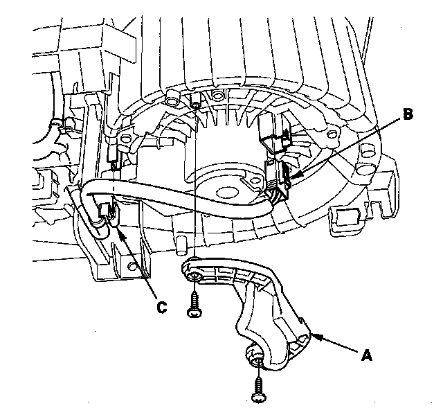 9. Disconnect the connector (B) from the blower motor. Remove the wire harness clip (C).