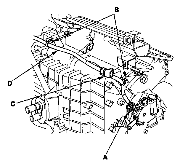 11. Disconnect the connector (A) from the air mix control motor. Remove the wire harness clips (B), the connector clip (C), and the wire harness (D).