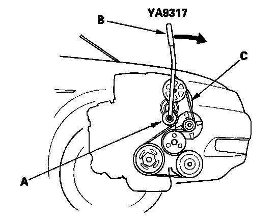 1. Move the tensioner (A) with the belt tension release tool (B) in the direction shown to relieve tension from the drive belt (C), then remove the drive belt.