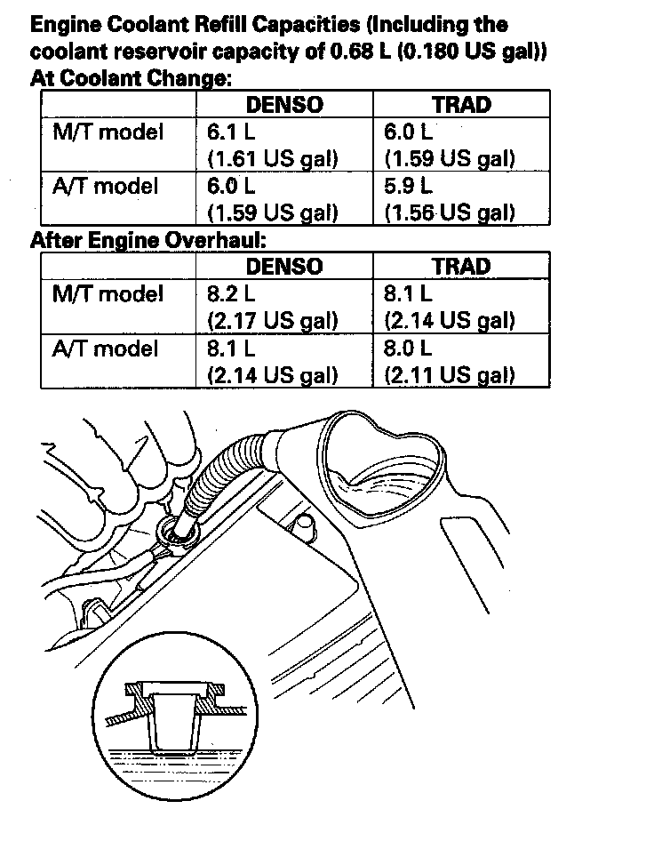 ^ If the vehicle is regularly driven in very low temperatures (under -31°F, -35°C) a 60% concentration of coolant should be used. To accomplish this, pour 1.6 L (0.4 US gal) of Honda Coolant Concentrate (P/N OL999-9020) into the radiator first, then add Honda Long Life antifreeze/Coolant Type 2 until the radiator is full.