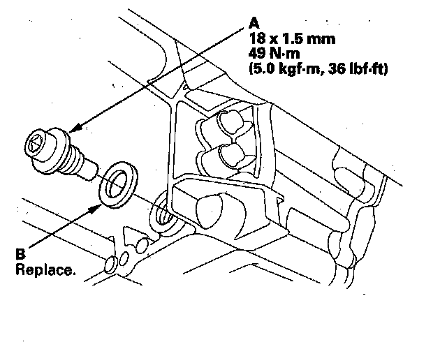 3. Remove the drain plug (A), and drain the automatic transmission fluid (ATF). Then reinstall the drain plug with a new sealing washer (B).