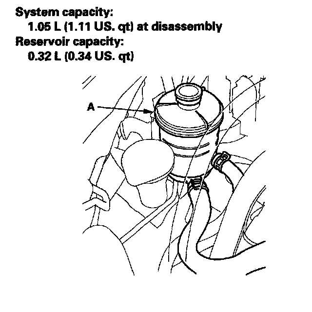 1. Remove the reservoir from its holder. Raise the reservoir, then disconnect the return hose (A) to drain the reservoir. Take care not to spill the fluid on the vehicle. Wipe off any spilled fluid at once.