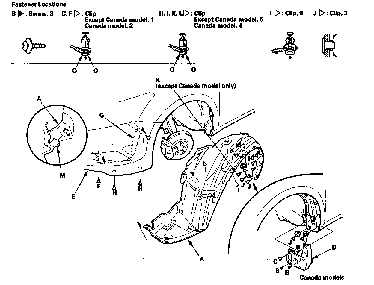 3. From the wheel arch, remove the clips (I, J, K) that secure the front inner fender (and splash shield) to the body.
