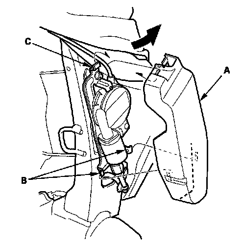 8. Disconnect the lumbar support motor connector (A), and detach the harness clip (B). Remove the nuts, then remove the lumbar support motor (C).