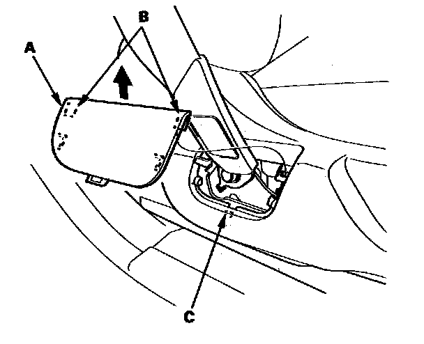 2. Slide the front seat all the way forward. Carefully pry up on the bottom of the anchor cover (A) to release the hooks (B) and the tab (C), then remove the cover by pulling it upward.