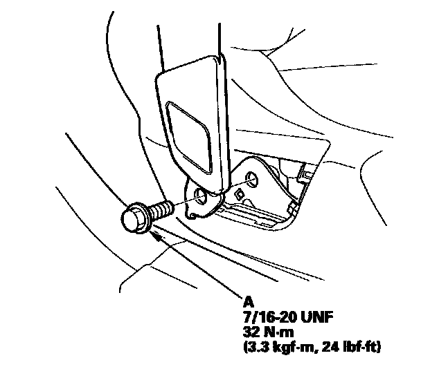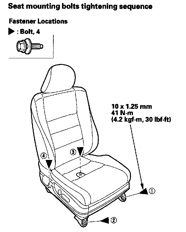 - Tighten the seat mounting bolts to the specified torque in the sequence shown. Slide the seat all the way back and tighten (1) and (2), then slide it forward and tighten (3) and (4). The driver's seat is shown; the passenger's seat is symmetrical.