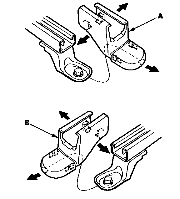 4. Slide the front seat all the way forward, and remove the seat track outer end covers (A) and the seat track inner end covers (B) from the back of both seat tracks.