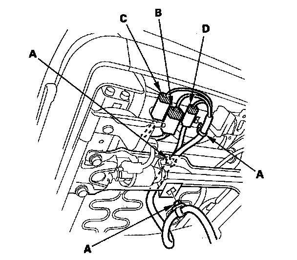 8. Lift up the front seat, then detach the harness clips (A), and disconnect the seat wire harness connector (B), the side airbag connector (C), and the seat belt buckle switch connector (D).
