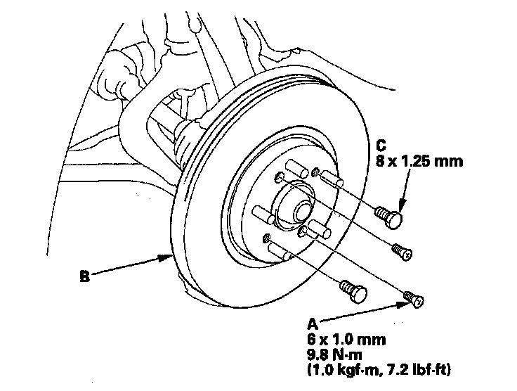 NOTE: If the brake disc is stuck to the front hub, thread two 8 x 1.25 mm-bolts (C) into the brake disc to push it away from the front hub. Turn each bolt 90 degrees at a time to prevent the brake disc from binding.