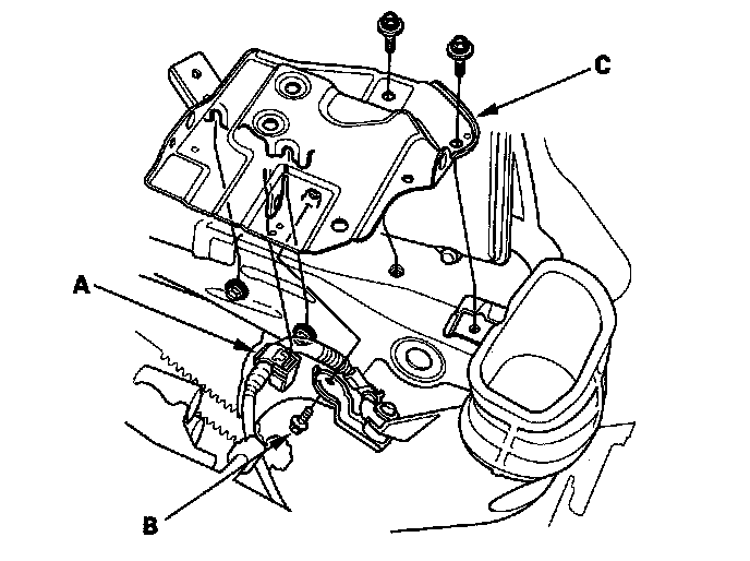 8. Remove the harness clamp (A) and the bolt (B), then remove the battery base (C).