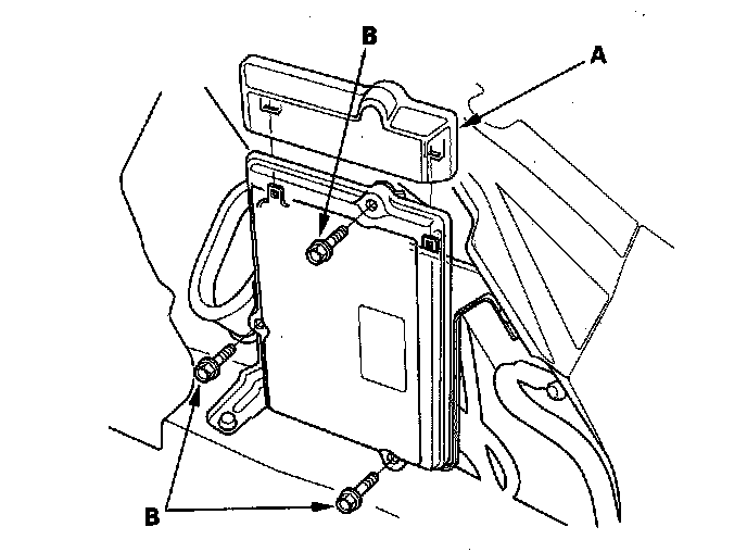 10. Remove the engine control module (ECM)/powertrain control module (PCM) cover (A), then remove the three bolts (B) securing the ECM/PCM.