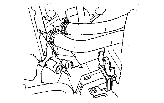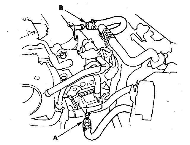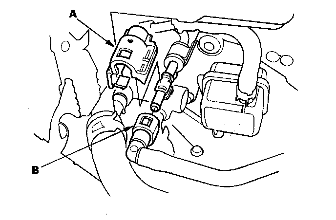 13. Remove the evaporative emission (EVAP) canister hose (A) and the brake booster vacuum hose (B).