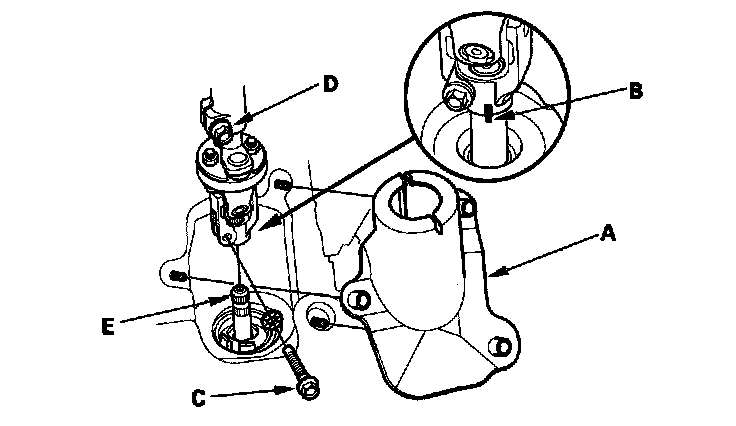 19. Make a reference mark (B) across the steering joint and the steering gearbox pinion shaft. Remove the steering joint bolt (C), and loosen the steering joint bolt (D), then disconnect the steering joint from the steering gearbox pinion shaft (E).