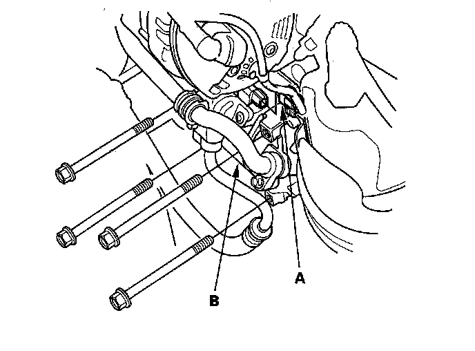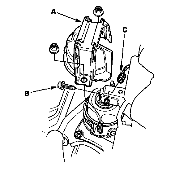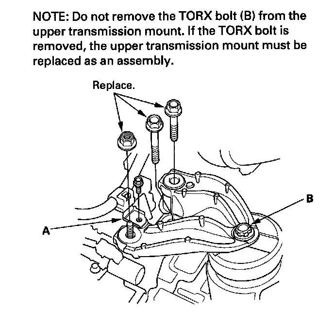 NOTE: Do not remove the TORX bolt (B) from the upper transmission mount. If the TORX bolt is removed, the upper transmission mount must be replaced as an assembly.