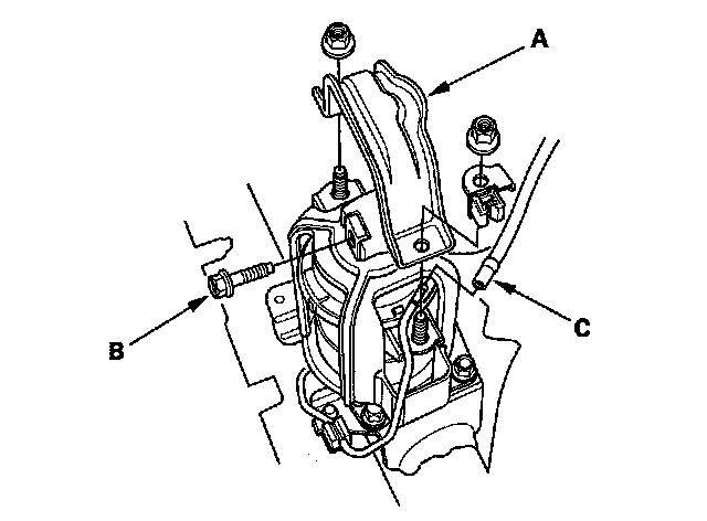 45. M/T model: Remove the front engine mount stop (A), then remove the front engine mount bolt (B) and the vacuum hose (C).
