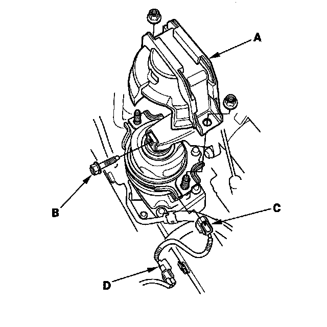 46. A/T model: Remove the front engine mount stop (A), then remove the front engine mount bolt (B) and disconnect the active control engine mount (ACM) connector (C) and remove the connector (D) from the front subframe.