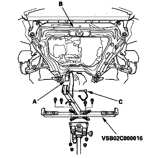 51. Attach the front subframe adapter (VSB02C000016) to the subframe by hanging the belt (A) over the front of the subframe (B), then secure the belt with its stop (C).
