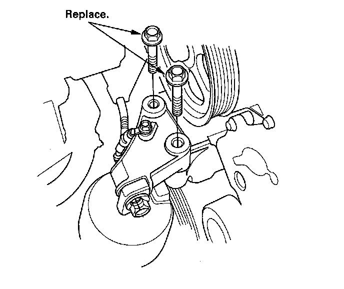 16. Remove the power steering (P/S) pump outlet line (A) and the P/S pump inlet line (B) from the P/S pump and remove the P/S hose bracket (C), then plug the outlet line and the P/S pump.