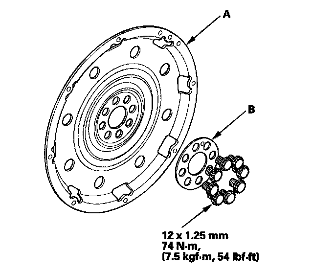 Torque the flywheel mounting bolts (B), in a crisscross pattern in several steps.