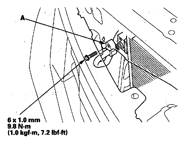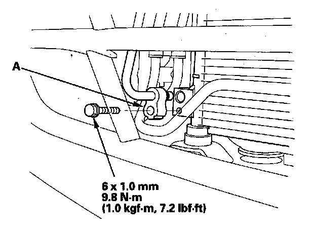 5. Remove the bolt, then disconnect the discharge hose (A) from the A/C condenser.