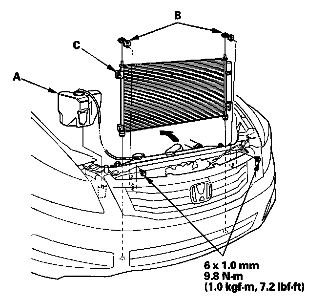 7. Remove the bolts, then remove the A/C condenser upper mount brackets (B). Remove the A/C condenser (C) by lifting it up. Be careful not to damage the radiator or condenser fins when removing the A/C condenser.