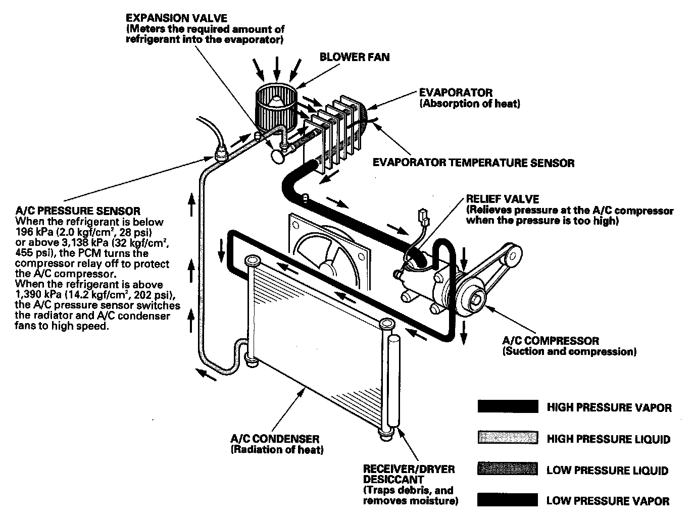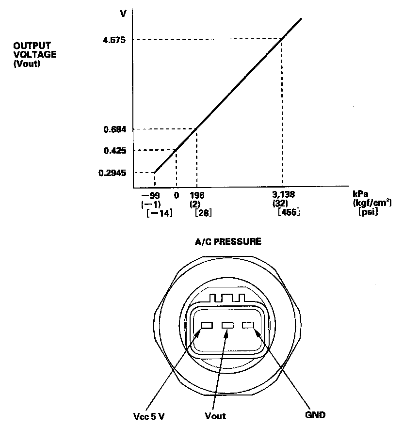 NOTE: When the refrigerant is below 196 kPa (2.0 kgf/sq.cm, 28 psi) or above 3,138 kPa (32 kgf/sq.cm, 455 psi), the PCM turns the compressor relay off to protect the A/C compressor. When the refrigerant is above 1,390 kPa (14.2 kgf/sq.cm, 202 psi), the A/C pressure sensor switches the radiator and A/C condenser fans to high speed.