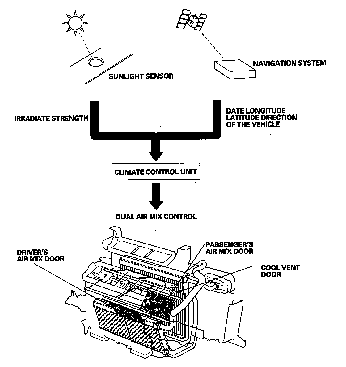 This system automatically controls the temperature and the vent mode of the air direction to the driver and passenger's side depending on the angle of the sun and the direction of the vehicle. It calculates information such as date, time, longitude, and latitude from the navigation system, as well as the irradiate strength of the sun from the sunlight sensor, to determine the appropriate mode position and temperature to be directed to each side.