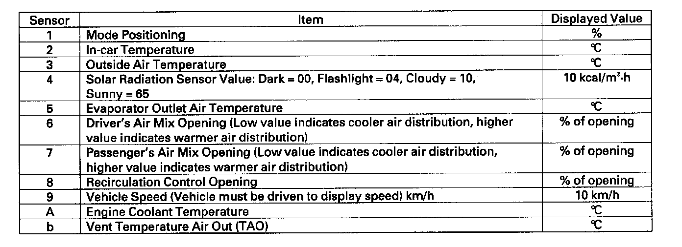 Displaying Sensor Inputs at the Climate Control UnitThe climate control unit has a mode that displays sensor inputs it receives. This mode shows you what the climate control unit is receiving from each of the sensors, one at a time, and it can help you determine if a sensor is faulty.