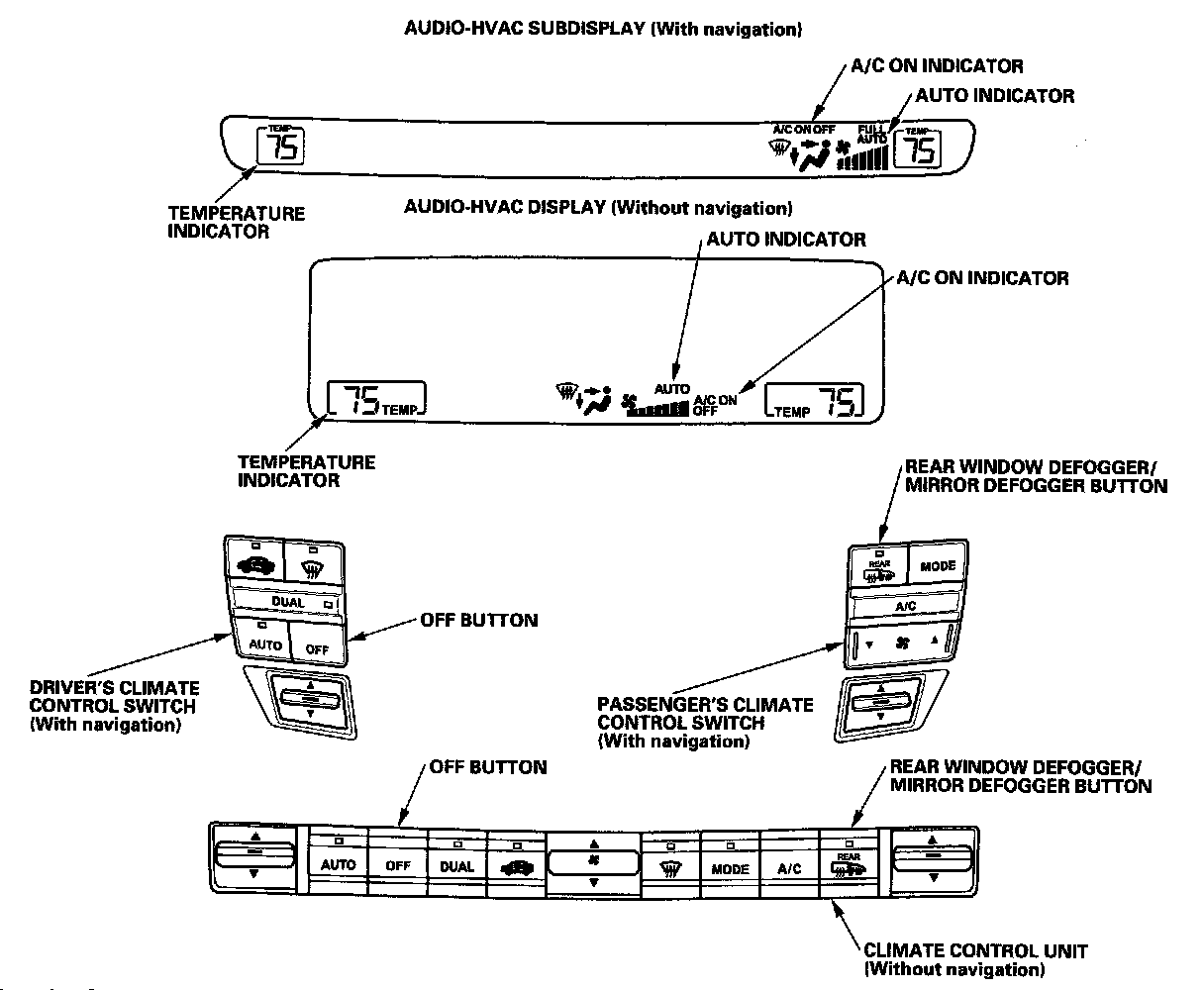 2. Press and hold the OFF button, then within 10 seconds press and release the REAR WINDOW DEFOGGER/MIRROR DEFOGGER button five times. Release the OFF button; then the self-diagnostic begins.