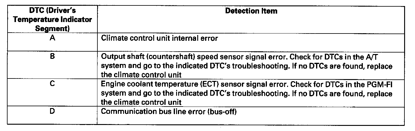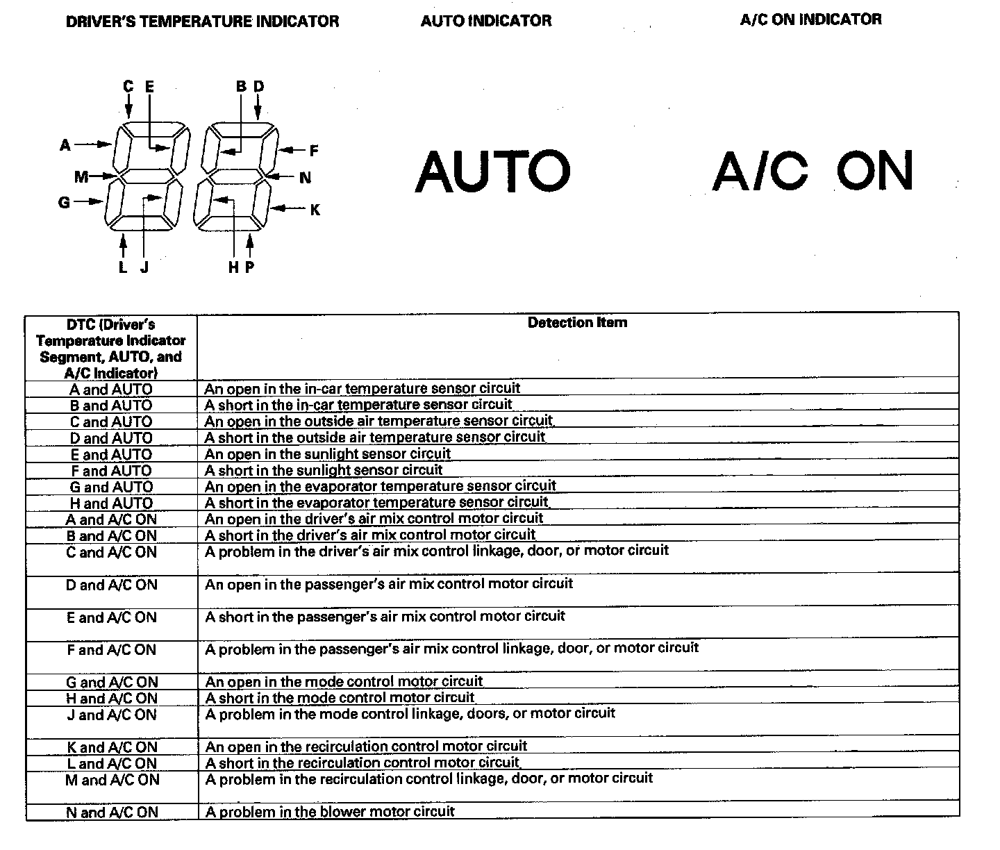- If there is a problem with the system, it will flash 88 and AUTO, 88 and A/C ON, or 88 AUTO and 88 A/C ON, and one or more of the 14 indicator segments (A through P). Refer to checking for DTCs.