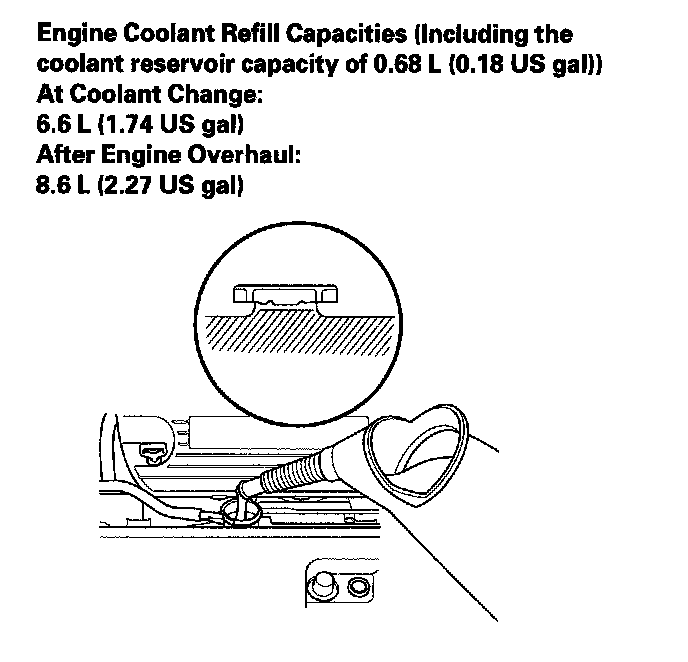 9. Pour Honda Long Life Antifreeze/Coolant Type 2 into the radiator up to the base of the filler neck.
