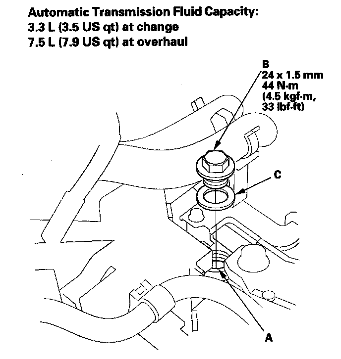 7. Install the ATF filler bolt (B) and a new sealing washer (C).