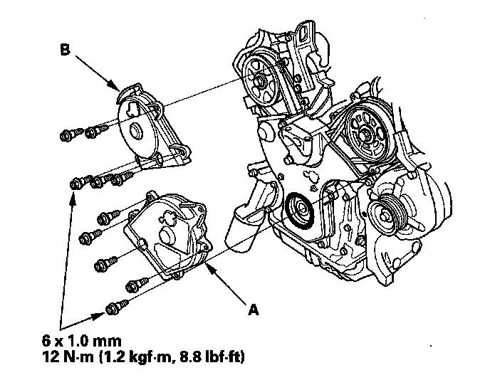 3. Set the timing belt drive pulley to top dead center (TDC) by aligning the TDC mark (A) on the tooth of the timing belt drive pulley with the pointer (B). on the oil pump.