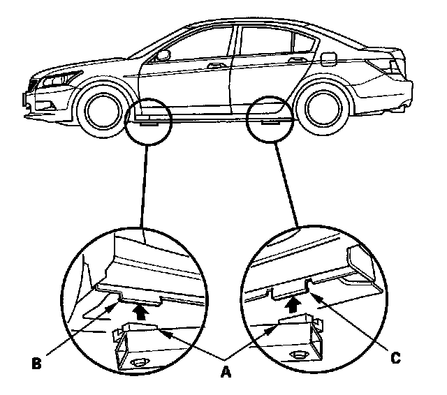 1. Position the lift blocks (A), under the vehicle's front support points (B) and rear support points (C).