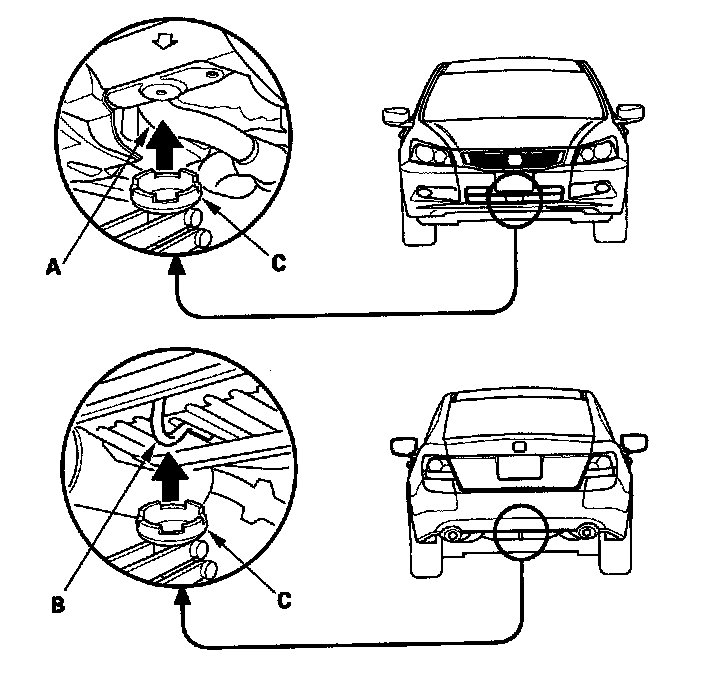 3. Position the floor jack under the front jacking bracket (A) or the rear jacking bracket (B). Center the jacking bracket on the jack lift platform (C), and jack up the vehicle high enough to fit the safety stands under it.