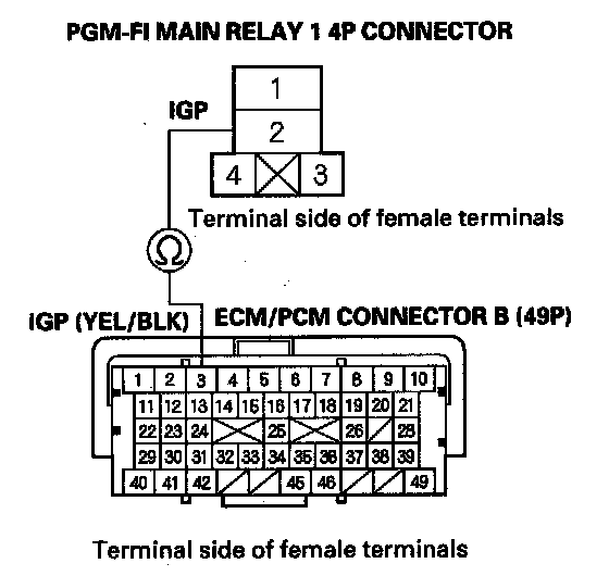 40. Check for continuity between body ground and PGM-FI main relay 1 4P connector terminals No. 1 and No. 4 individually.