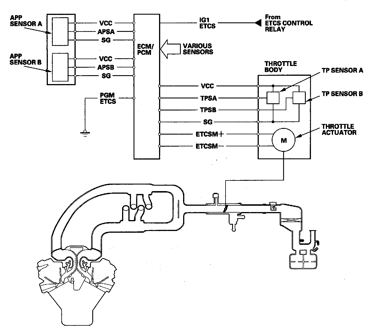 Electronic Throttle Control System DiagramThe electronic throttle control system consists of the throttle actuator, throttle position (TP) sensor A/B, accelerator pedal position (APP) sensor A/B, the electronic throttle control system (ETCS) control relay, and the ECM/PCM.