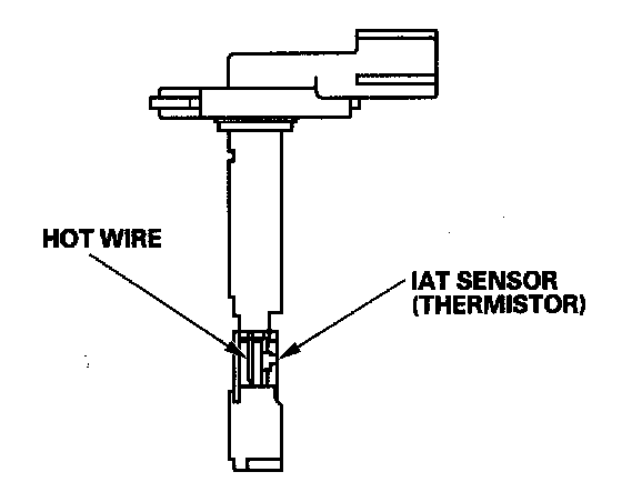 The mass airflow (MAF) sensor/intake air temperature (IAT) sensor contains a hot wire and a thermistor. It is located in the intake air passage. The resistance of the hot wire and thermistor change due to intake air temperature and air flow. The control circuit in the MAF sensor controls the current to keep the hot wire at a set temperature. The current is converted to voltage in the control circuit, then output to the ECM/PCM.