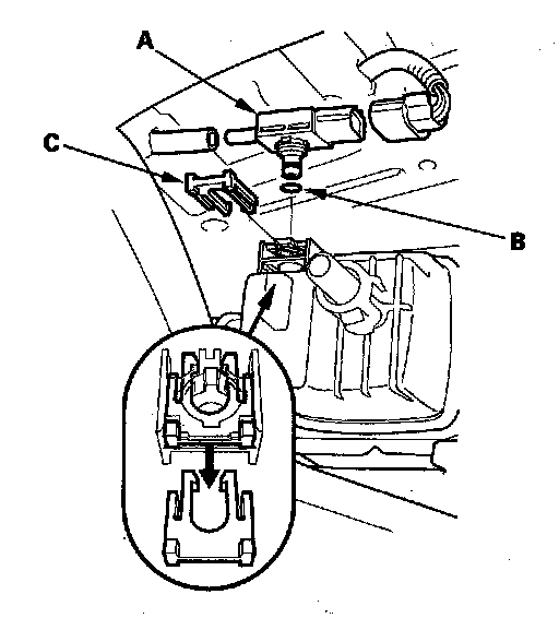 4. Install the parts in the reverse order of removal with a new O-ring (B) and a new retainer (C).