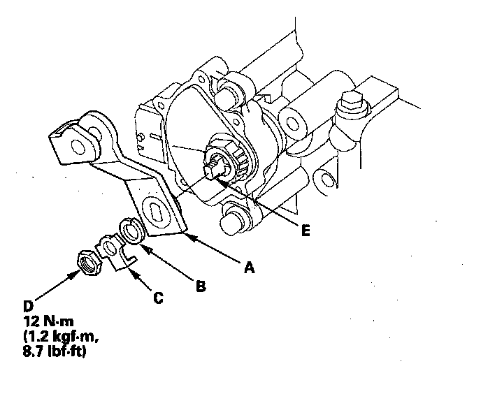 17. Install the control lever (A), spring washer (B), lock washer (C), and locknut (D) on the control shaft (E).