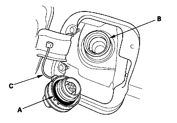2. Check the fuel fill cap seal (A) and the fuel fill pipe mating surface (B). Verify that the fuel fill cap tether cord (C) is not caught under the cap.