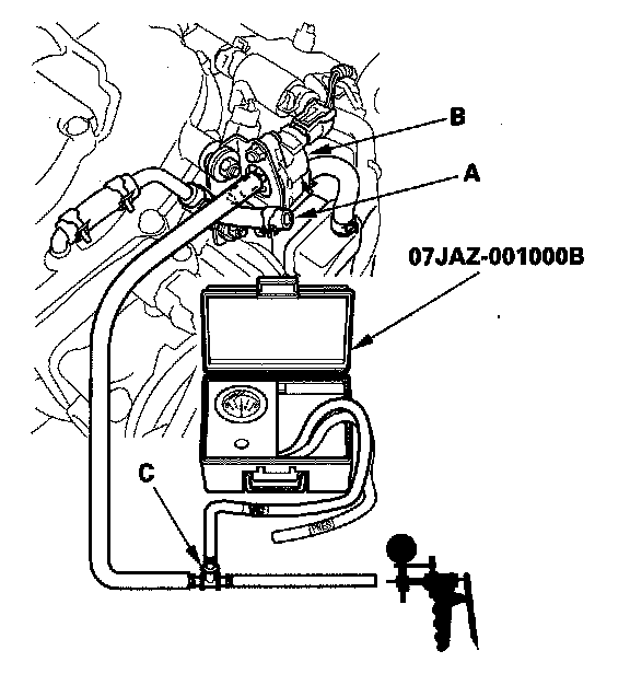 8. Disconnect the vacuum hose (A) from the EVAP canister purge valve (B) in the engine compartment, and connect a T-fitting (C) from the vacuum gauge and the vacuum pump/gauge 0 - 30 in.Hg, to the EVAP canister purge valve as shown.