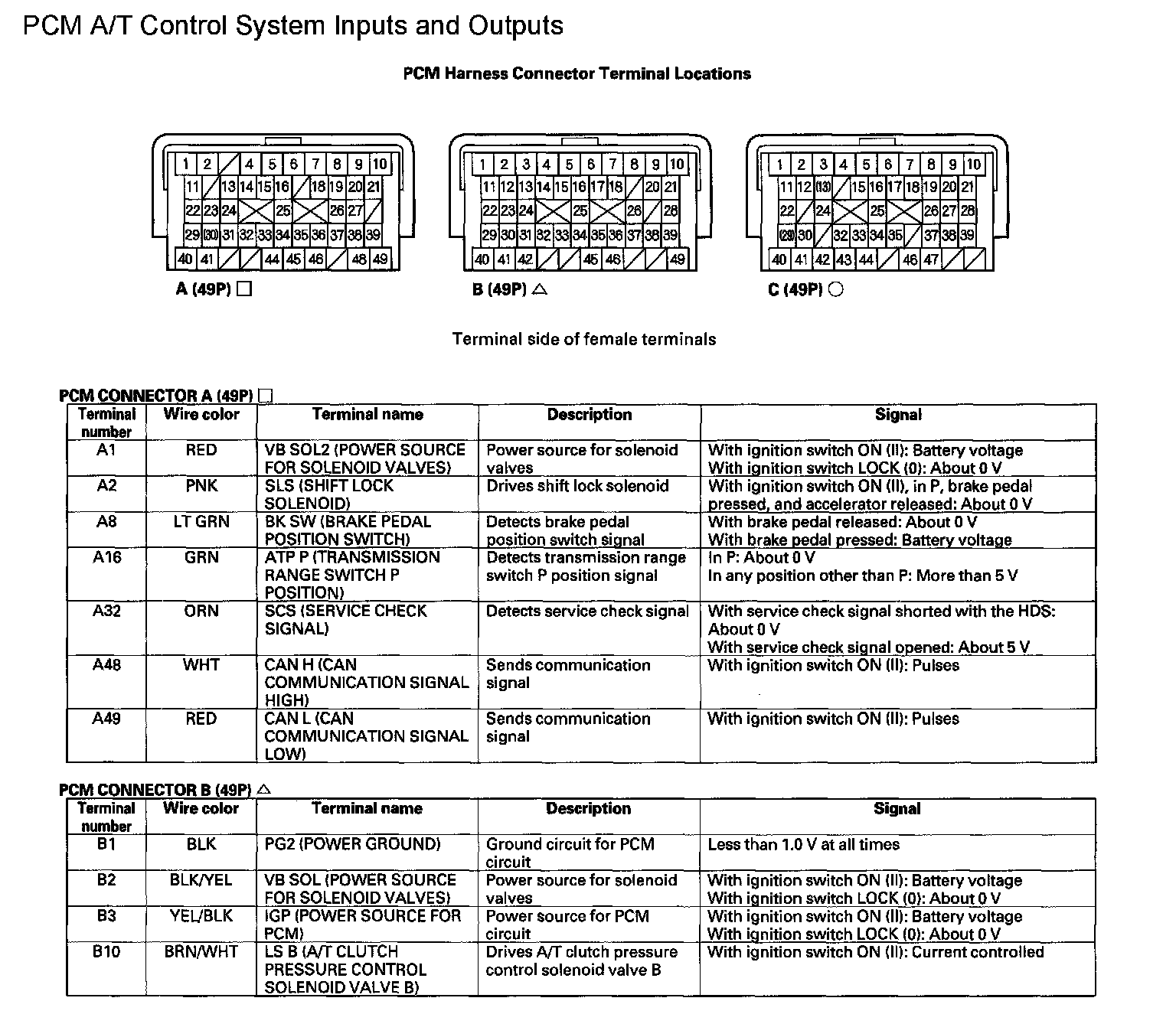 PCM A/T Control System Inputs and Outputs