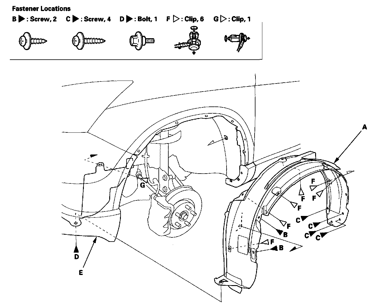 2. Remove the clips (F, G) securing the front inner fender (and splash shield) on the body.