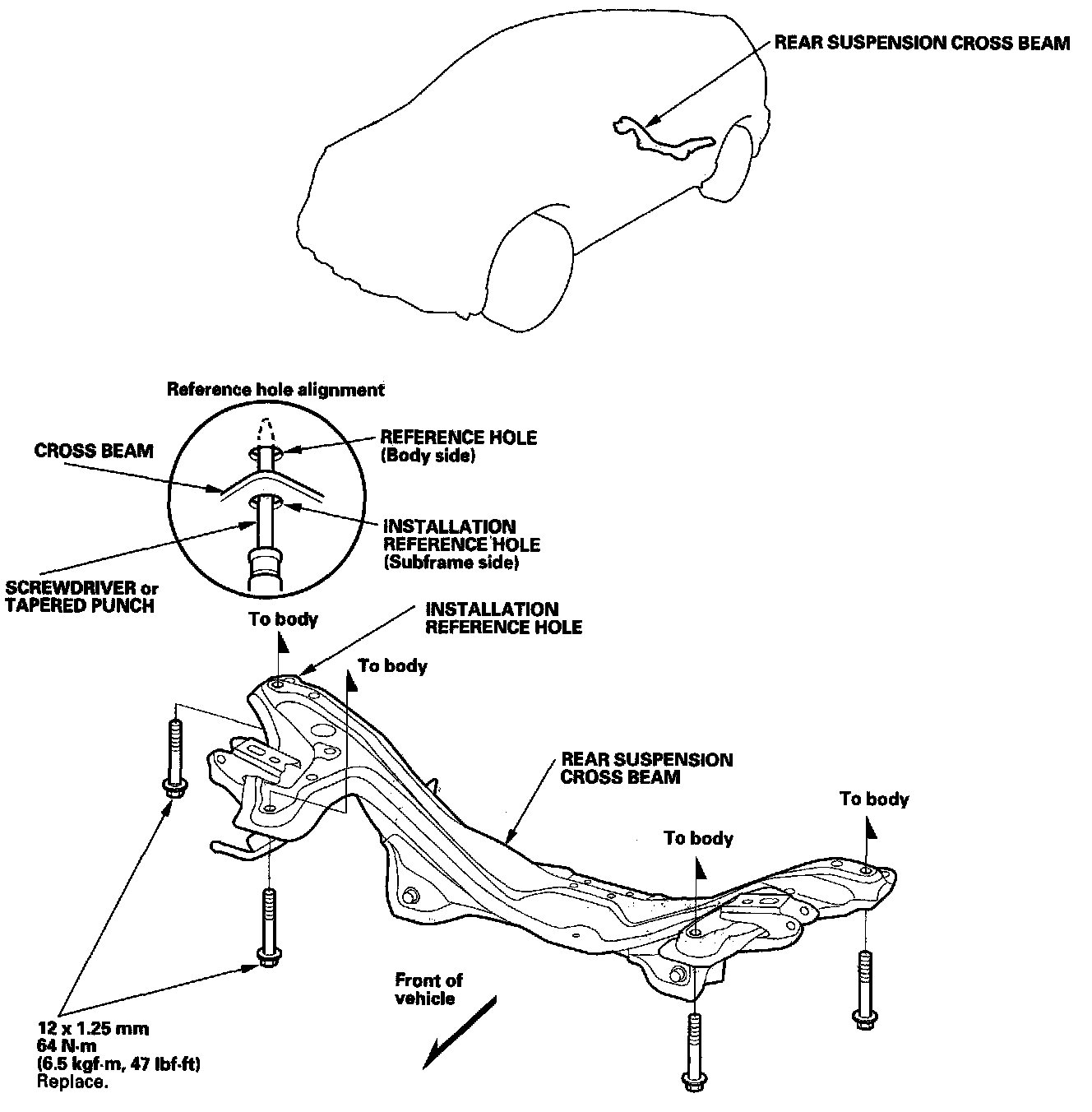 - When installing, align both installation reference holes in the subframe with both reference holes in the body using a screwdriver or tapered punch as a guide.
