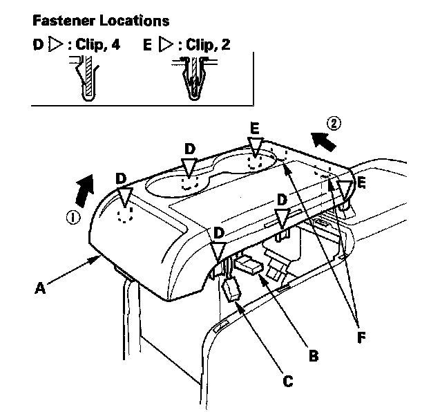 3. Pull the rear portion of the center console upper panel up, remove the clips (E), and release the hooks (F).